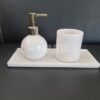 Zu den Teilen des Badezimmersets aus Marmor gehören ein Flüssigseifenspender, eine Baumwollschale, ein Zahnbürstenhalter und eine Seifenschale in einer Marmorplatte. Darüber hinaus gehört auch der Toilettenbürstenhalter zu den Bestandteilen des Sets. Durch die harte, langlebige Struktur von Marmor werden die Teile des Sets bei Unfällen wie Stößen und Stürzen nicht beschädigt. Alle Teile des Sets sind poliert und präsentieren sich in glänzender Optik. Sie können den Preis und die Eigenschaften des Produkts erfahren, indem Sie sich an unser Unternehmen wenden.